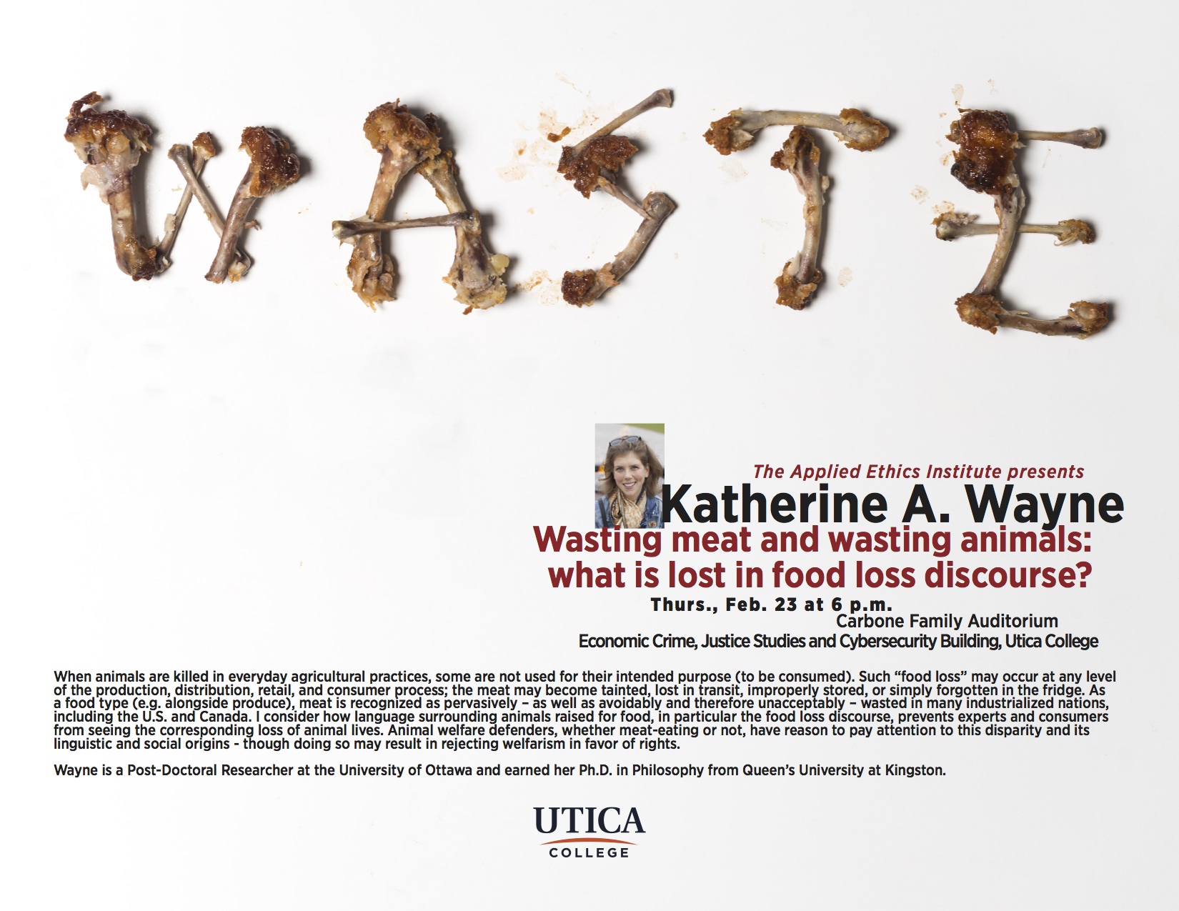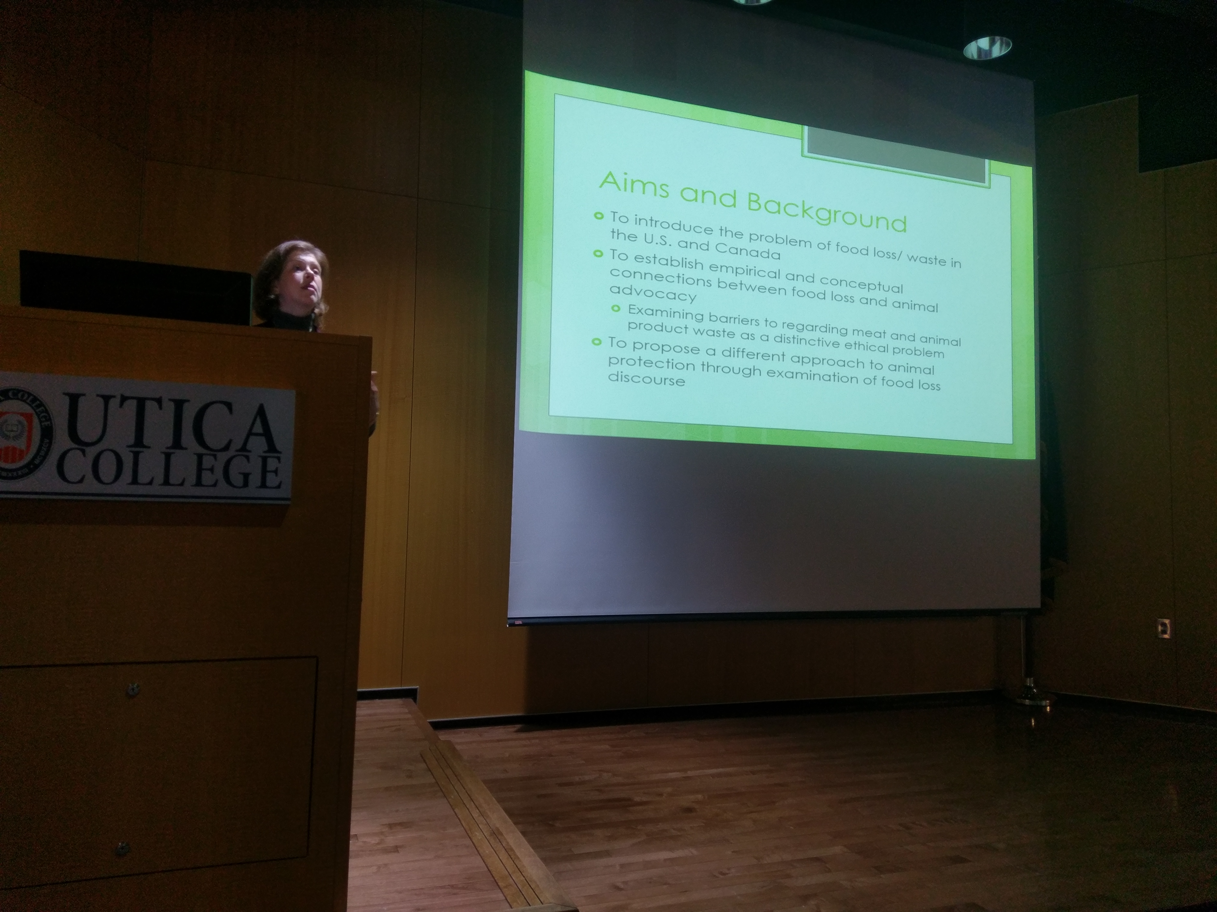 At 6:00 pm on Thursday, February 23, 2017, Professor Katherine A. Wayne gave a public lecture titled "Wasting Meat and Wasting Animals: What is Lost in Food Loss Discourse?". The talk was hosted hosted in Carbone Auditorium on Utica College's campus at 1600 Burrstone Rd., Utica, NY. Professor Wayne suggested that when animals are killed in everyday agricultural practices, some are not used for their intended purpose (to be consumed). Such “food loss” may occur at any level of the production, distribution, retail, and consumer process; the meat they become may be tainted, lost in transit, improperly stored, or simply forgotten in the fridge. As a food type (e.g. alongside produce), meat is recognized as pervasively – as well as avoidably and therefore unacceptably – wasted in many industrialized nations, including the U.S. and Canada. She considers how language surrounding animals raised for food, in particular the food loss discourse, prevents experts and consumers from seeing the corresponding loss of animal lives. Animal welfare defenders, whether meat-eating or not, have reason to pay attention to this disparity and its linguistic and social origins - though doing so may result in rejecting welfarism in favour of rights.
